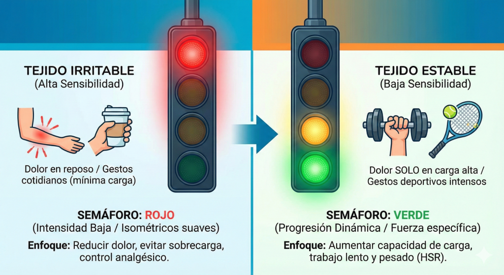 Si el paciente presenta dolor en reposo o con gestos triviales como coger una taza, estamos ante una alta irritabilidad. En este escenario, la tolerancia a la carga es mínima y cualquier ejercicio dinámico agresivo puede ser contraproducente. Por el contrario, un paciente que solo refiere molestias tras su partido de pádel permite una progresión de carga mucho más ambiciosa desde el primer día .
